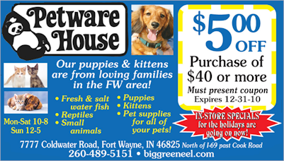 Petware House is conveniently located at 7477 Lima Road, Fort Wayne, Indiana, which is just moments north of West Cook Road and a few minutes drive from the I-69. While heading north on Lima Road, you will find us on the left hand side of Lima Road, next to DAVCO Auto. We have ample parking for our visitors, parking for seniors, handicap and expectant mom’s. Additional accessibility is available for handicap and for the delivery of large items into and out of our store location. Come into our new showroom for the largest selection of healthy pets, pet food, pet accessories and let our friendly, knowledgeable staff help you find that perfect pet and solutions that work best for you.